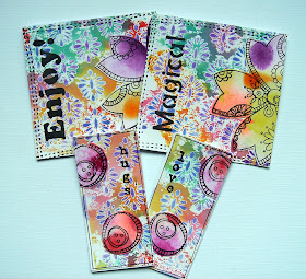 Onze opdracht is niet lastig, want alles mag! Omdat ik mee doe aan de gelliplate-30-daagse van Birgit Koopsen heb ik heel veel mooie prints liggen. Dit is er één van eergisteren, “circles”. Moeilijk kiezen welk stuk je gebruikt...is allemaal gaaf. Eén kaartje met veel turquoise en één met veel roze.