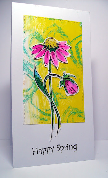 3. Ja hoor, kom maar op met de lente! Ik houd ervan. Gaaf kaartje! Leuk dat de steeltjes er onderuit steken.